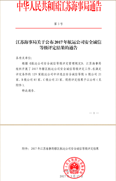 中港建設集團榮獲“江蘇海事局安全誠信等級A級公司” 榮譽稱號