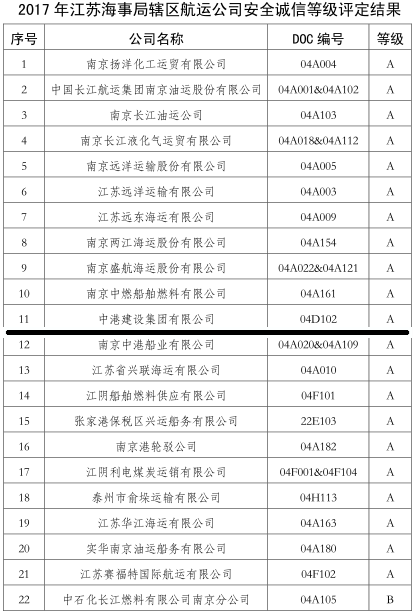 Zhonggang Construction Group., Ltd. was Granted “Class A Safe and Honest Company” in Shipping Company Safety and Honesty Grading 2017 Sponsored by Jiangsu Maritime Safety Administration