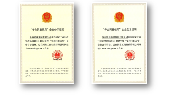 2014年6月,經國家工商行政管理總局對全國所有在冊企業進行考評,中港建設集團有限公司及下屬公司蘇州凱達路材股份有限公司雙雙被國家工商總局認定為2012-2013年度“守合同重信用”企業稱號。近期,中港建設集團有限公司及下屬公司蘇州凱達路材股份有限公司收到國家工商行政管理總局“守合同重信用”企業榮譽證書。